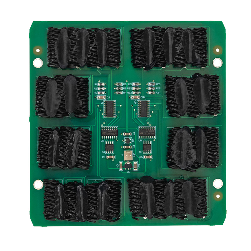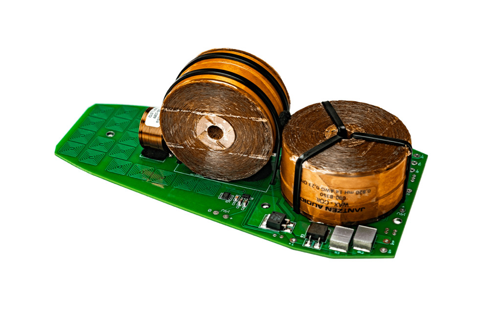 The active square Tesla coils are embedded in our circuitry boards – one coil on the top and the counter coil on the rear side. The principle is exactly the same as the active Tesla coil and thus a great ability to eliminate noise than the passive Tesla coils.